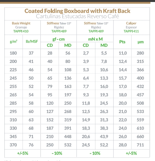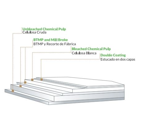 CMPC Boxboard utiliza en la fabricación de sus productos celulosa y fibra virgen de pino radiata, las cuales le permiten entregar un producto con una óptima relación gramaje/rigidez. Esto significa que a iguales valores de rigidez. CMPC ofrece productos con menor gramaje, lo que se traduce en ventajas comparativas para los clientes, ya que pueden obtener más pliegos y estuches por unidad de peso de cartulina.