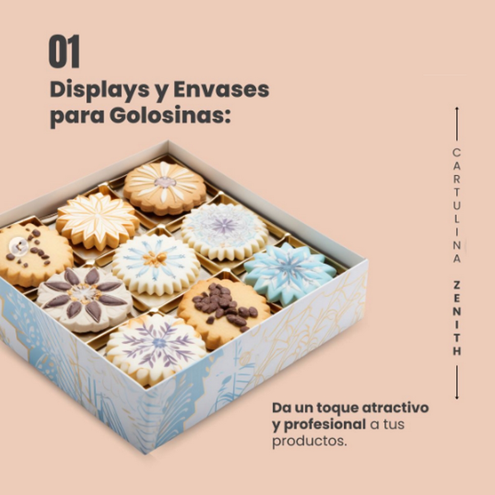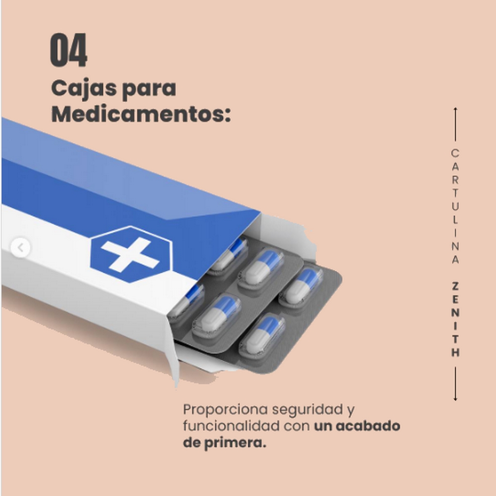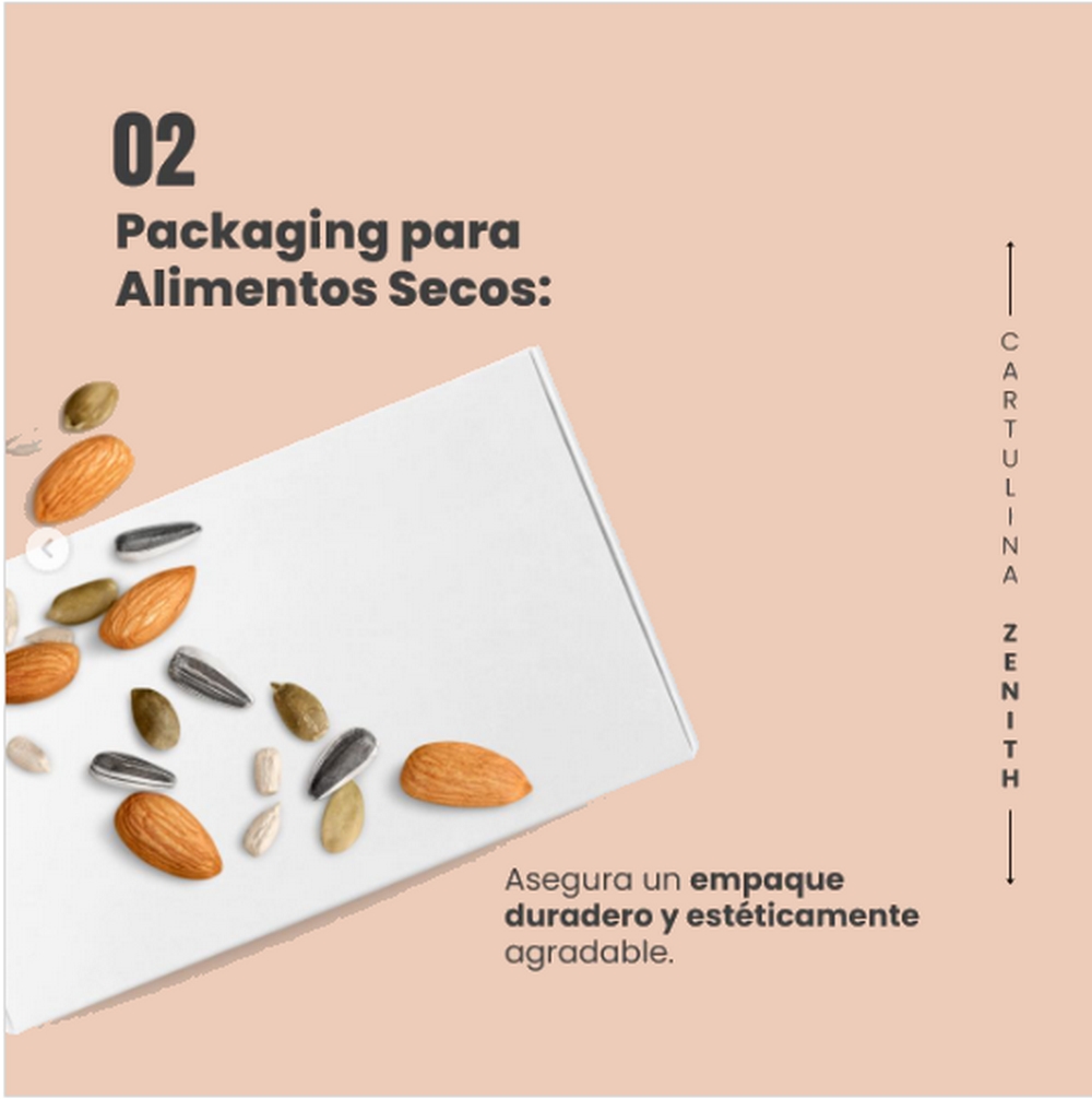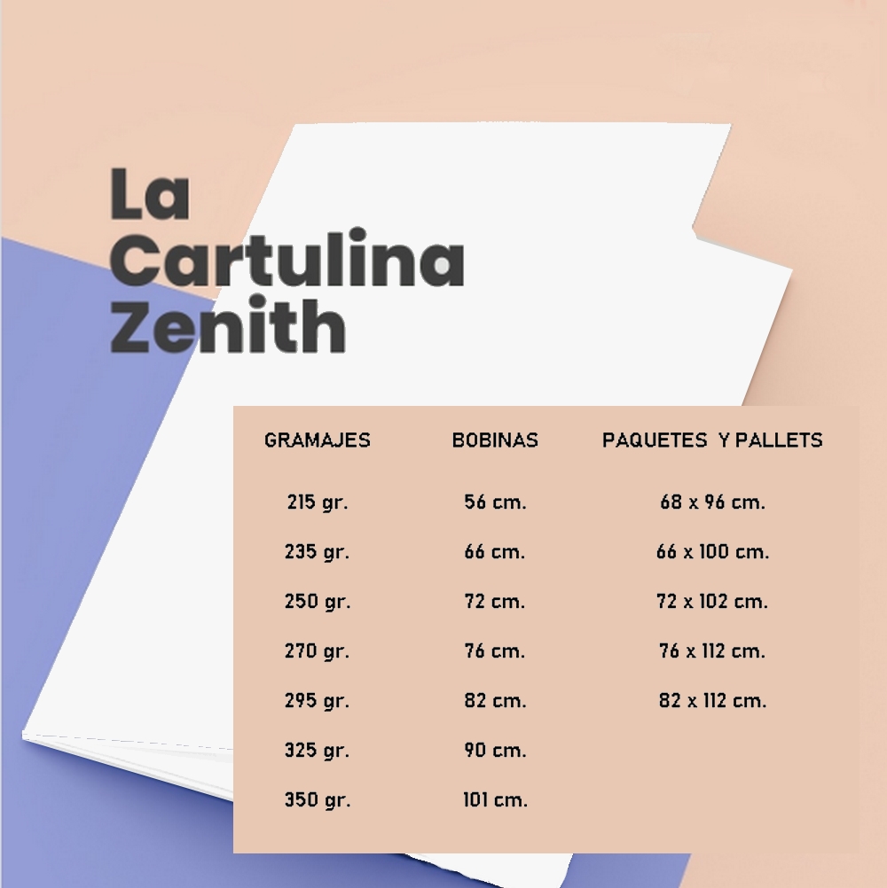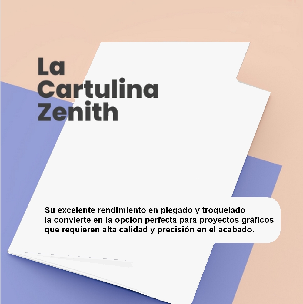 ZENITH es una cartulina triplex con base 100% fibra pura blanca, su interior posee fibras de alto rendimiento con valores de RCT y rigidez superiores, lo cual logra una validez bulky. Posee una superficie con triple encapado que permite impresos y terminaciones de cualquier tipo, es su acabado semi mate un fino realce a cualquier envase terminado.